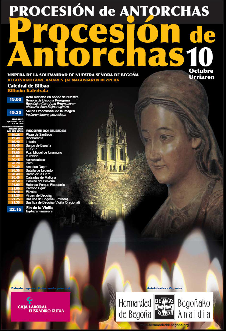 PROGRAMA I PROCESIÓN DE ANTORCHAS 10 DE OCTUBRE 19.00 Acto Mariano en la Catedral de Bilbao (Plaza Santiago. Casco Viejo) 19.30 Procesión de Antorchas Se rezará el Rosario Recorrido: Plaza Santiago, Bidebarrieta, Loteria, Banco España, La Cruz, Miguel de Unamuno, Iturribide, Prim, Amadeo Deprit, Batalla de Lepanto, Barrio de la Cruz, Calzadas de Mallona, Virgen de Begoña, Bilintx, Virgen de Begoña, Basílica de Begoña 21.30 Vigilia Oracional en la Basílica de Begoña. 22.15 Fin del Acto