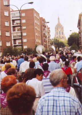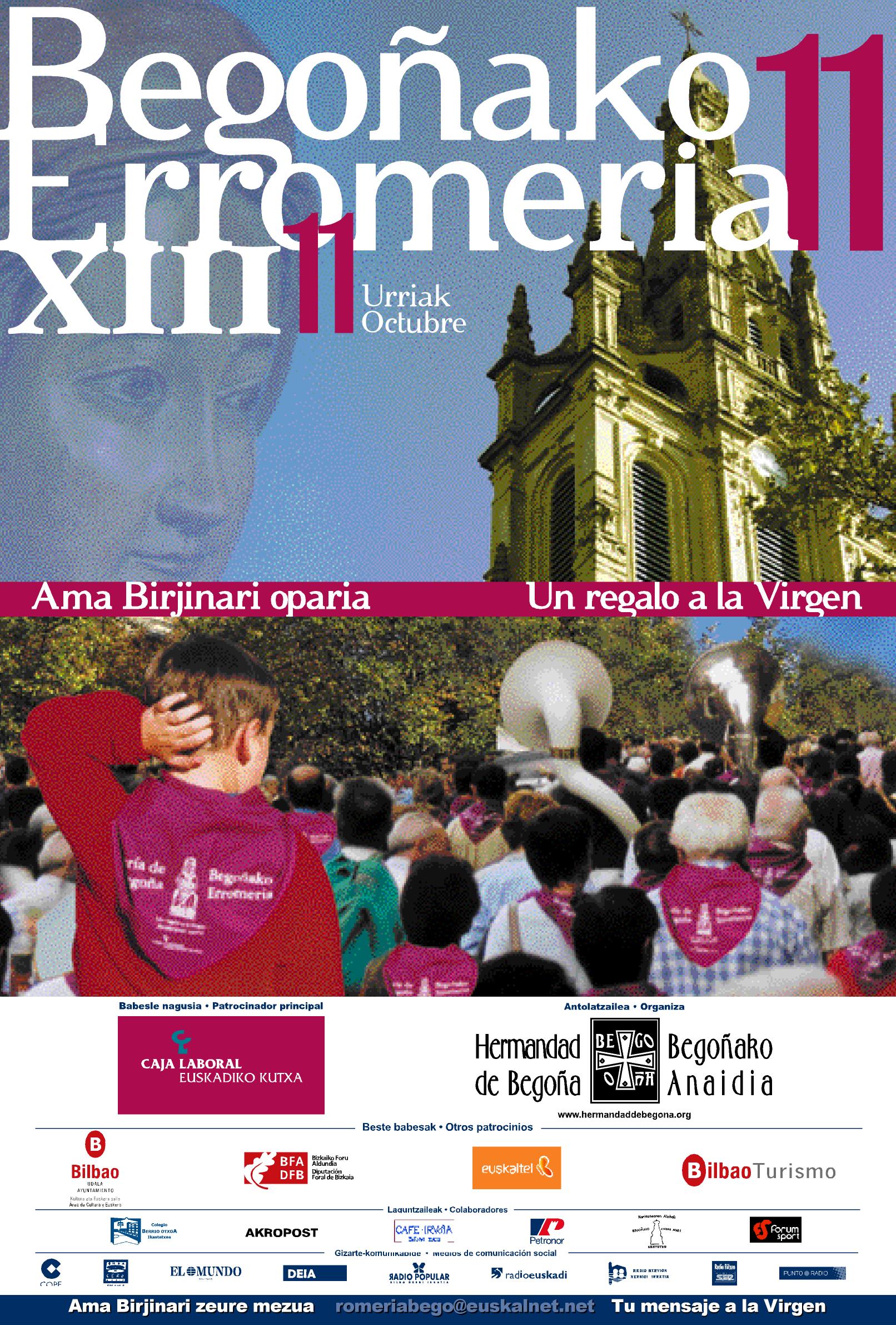 MEMORIA ROMERÍA Reinstaurada la Hermandad de Begoña, una de sus primeras decisiones fue la de subrayar su objetivo estatutario fundamental de fomentar la devoción a su Celestial Patrona la Virgen de Begoña. Ciertamente este objetivo quedaba cubierto en su primera etapa por la cofradía de gloria, la de la Madre de Dios de Begoña. De esta forma ya el año 1996 se decide respaldar la Fiesta del 15 de Agosto, día de la Asunción, que por otra parte es una fiesta de toda la cristiandad. De esta manera se aprobó respetar lo que hasta entonces y desde hace siglos había sido santo y seña de esta celebración en Begoña, es decir, la espontaneidad. Nadie podría decirse que organizaba a ese pueblo que desde todos los rincones acudía a visitar a la Amatxo. Sin embargo la Hermandad podría hacer un esfuerzo que era el de recordar con tiempo que ese era el día oportuno para ir a Begoña y de esta forma la información por todos los medios de comunicación había que hacerla de forma discreta. La Hermandad de Begoña necesitaba un día en el que centrar su trabajo para cumplir su objetivo estatutario. De esta forma se decidió organizar el año 1996 un encuentro de los devotos de la Virgen en el día de su festividad canónica. A pesar de que ante la propuesta la Hermandad se encontró con el escepticismo de muchos, sí consiguió el apoyo del Alcalde de Bilbao, José Ortuondo, y de otras instituciones entre las que hay que destacar a Radio Nervión y Radio Bilbao-Cadena SER, que fueron los primeros que ayudaron con anuncios gratuitos a movilizar a las casi tres mil personas que acudieron en aquella primera edición. La Romería del 11 de Octubre tiene su antecedente en la Peregrinación de los Bilbainos que se organizó en el año 1903, para conmemorar el Patronazgo de la Virgen sobre Bizkaia. En aquella ocasión el enfrentamiento entre católicos con sindicalistas y republicanos provocó graves disturbios y tiros al aire, más de cien, de los cuales una bala perdida mató a Marañón, jardinero de la Universidad de Deusto.